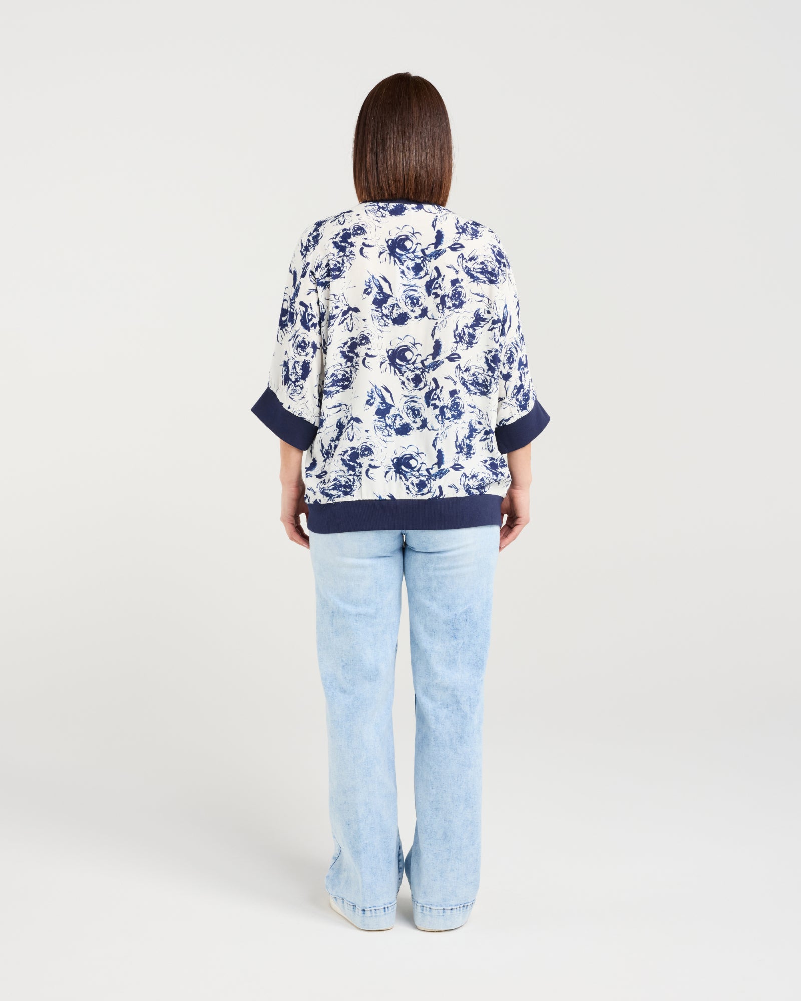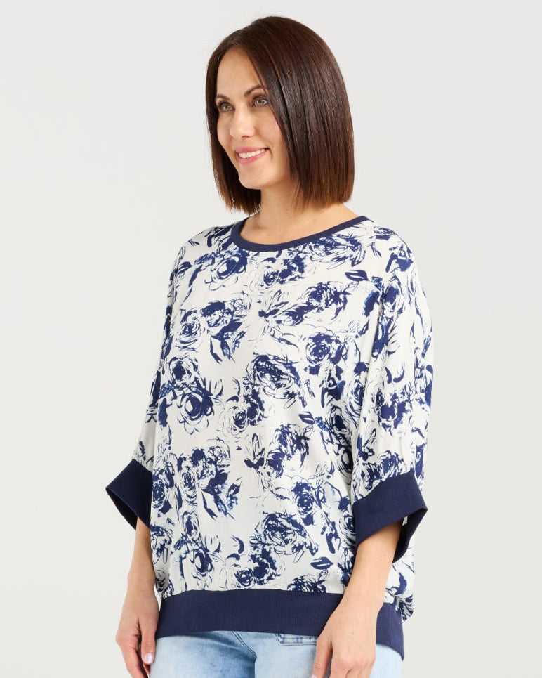 This relaxed-fit top combines comfort with effortless elegance. Designed with below-elbow sleeves, it features soft elasticated cuffs in a light blue contrast, perfectly matched with the hem for a polished finish.