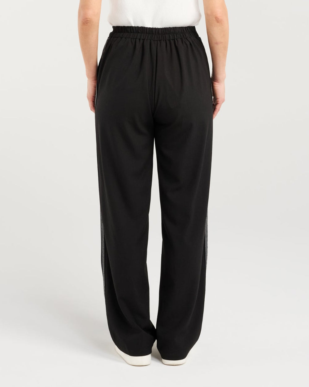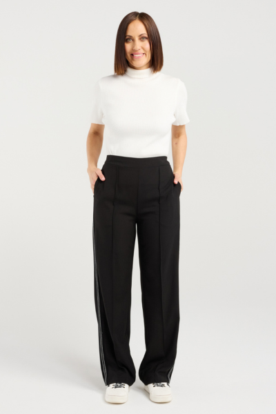 Refined and effortlessly versatile, these classic black pants are designed with a sleek side stripe and a subtle front crease detail for a flattering, elongated silhouette. The elasticated waistband offers all-day comfort without compromising on style, making them a go-to piece for your winter wardrobe.