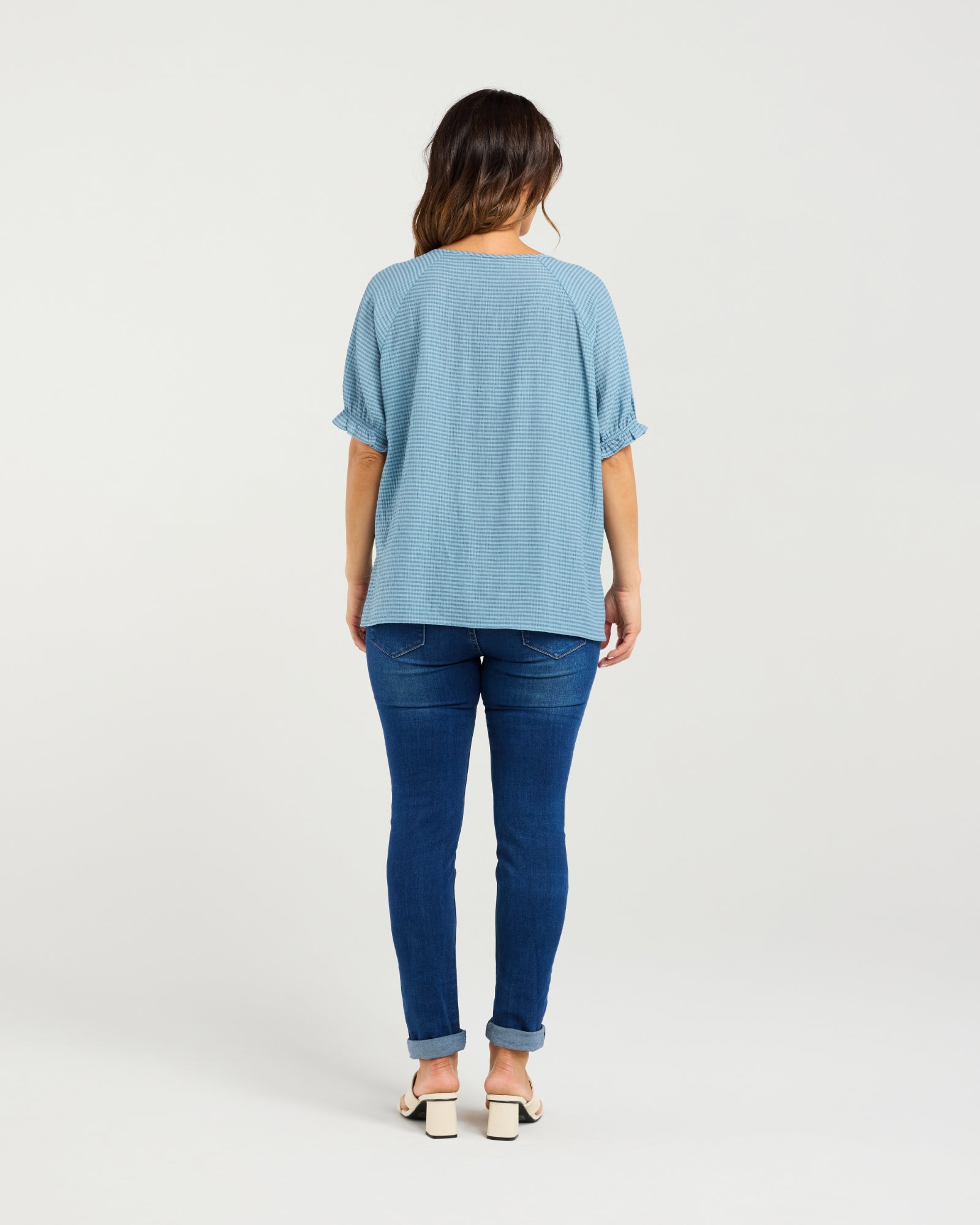 Effortlessly stylish and comfortable, this versatile top features elbow-length sleeves with soft elastic cuffs and a gently gathered front hem for a flattering shape. The longer back hem and side split create beautiful movement, while the round neckline keeps the look relaxed and easy to wear — perfect for any occasion.