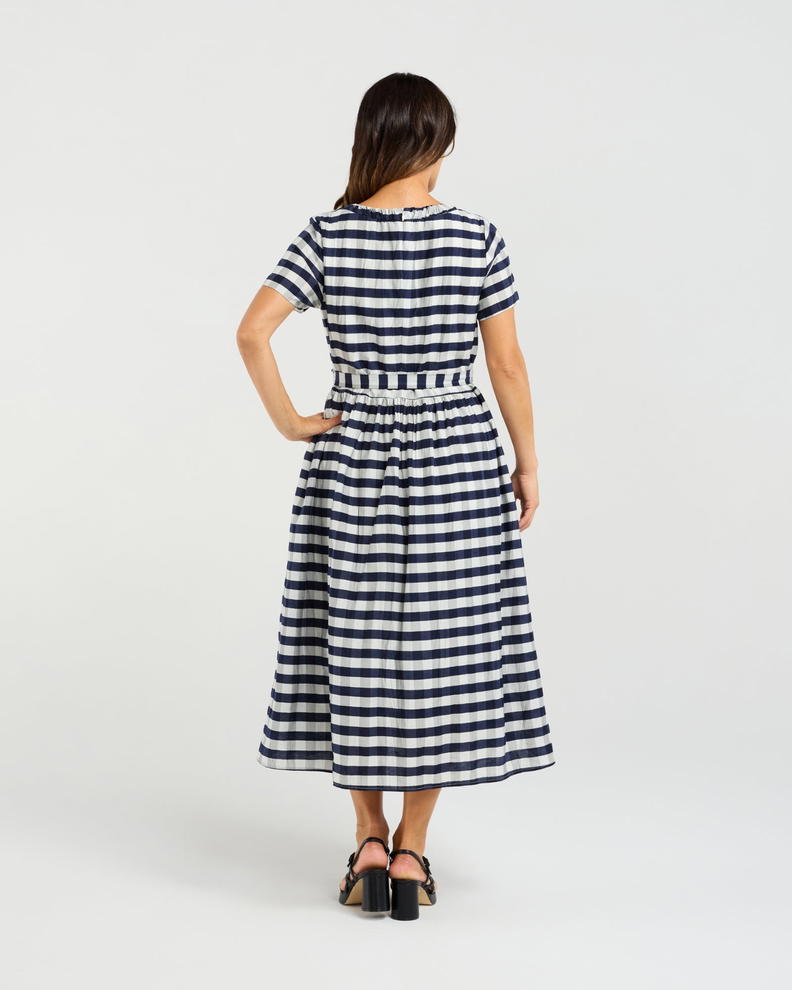 Effortlessly chic and comfortable, this dress features a round neckline and short sleeves, with an elasticated waist that can be adjusted with a self-tie for a perfect fit. The bold ink and white check pattern adds a modern, stylish twist to a classic silhouette, making it ideal for casual or everyday wear.