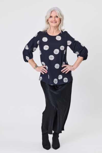This lightweight printed blouse features a classic round neckline and flattering three-quarter balloon sleeves gathered at the cuff for soft volume and shape. The bold all-over spot print adds a modern statement, set against a deep navy or black base for a sophisticated finish. An easy-to-style piece that works beautifully from office to evening.