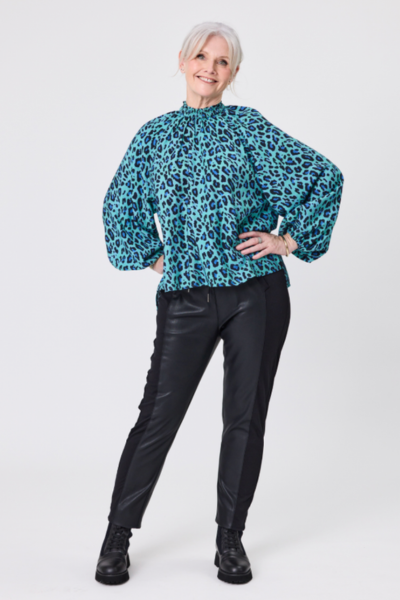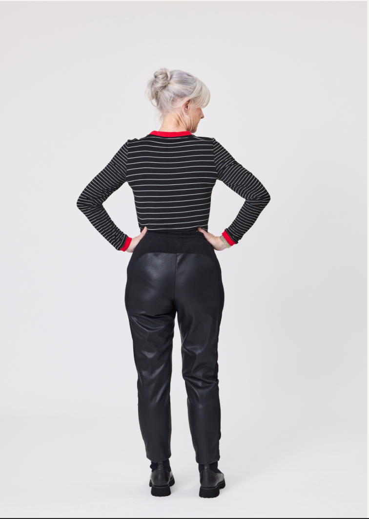 These black tapered pants feature a modern cropped ankle length and an easy pull-on design with adjustable front ties for all-day comfort. Designed with a stylish two-fabric construction, the front panels are crafted from sleek faux leather, while the side and back panels feature a soft stretch cotton blend for a flattering, flexible fit. A versatile statement pant that pairs effortlessly with knits, blouses, or layering pieces.