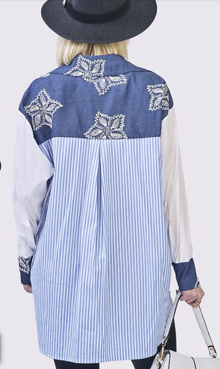 Elevate your everyday style with this Italian cotton oversized shirt, designed for relaxed comfort and timeless appeal. Showcasing a striking mix of stripe and floral patchwork prints, this long-sleeve shirt brings a modern artistic touch to a classic silhouette. Crafted from breathable 100% cotton, it offers an airy, lightweight feel — perfect for spring and summer dressing.