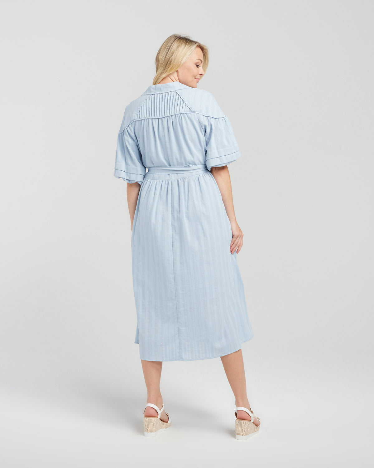 The Jamie Dress in Pastel Blue is a summer favourite with its easy button-down style and soft cotton feel. Featuring yoke paneling, puffed short sleeves, and a self-belt at the waist, it offers a flattering, comfortable fit. The below-the-knee length adds a classic touch, making it perfect for warm-weather days.