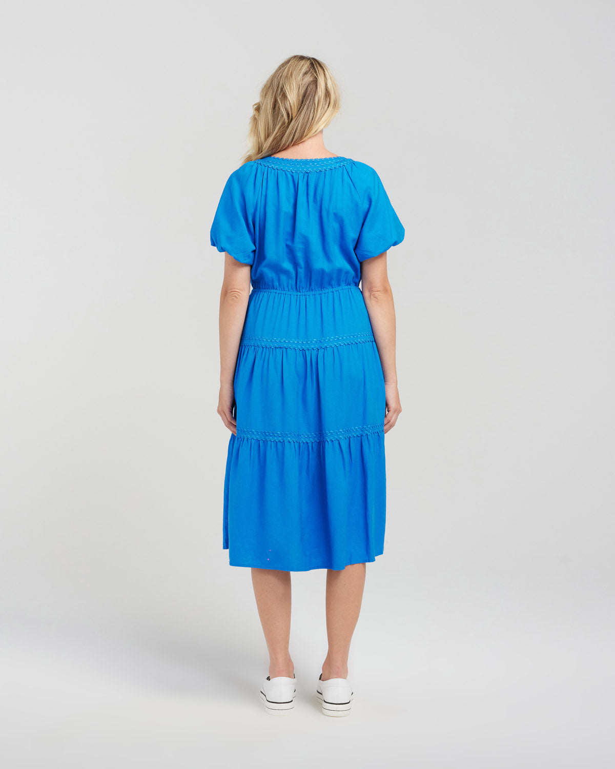 The Jillian Dress in Blue brings a soft, feminine charm to your wardrobe. Featuring a round neckline, puff short sleeves, and a tiered skirt with delicate trims, it creates a beautiful silhouette that falls below the knee. Soft and lightweight in 100% rayon, this dress is perfect for warm days and effortless dressing.