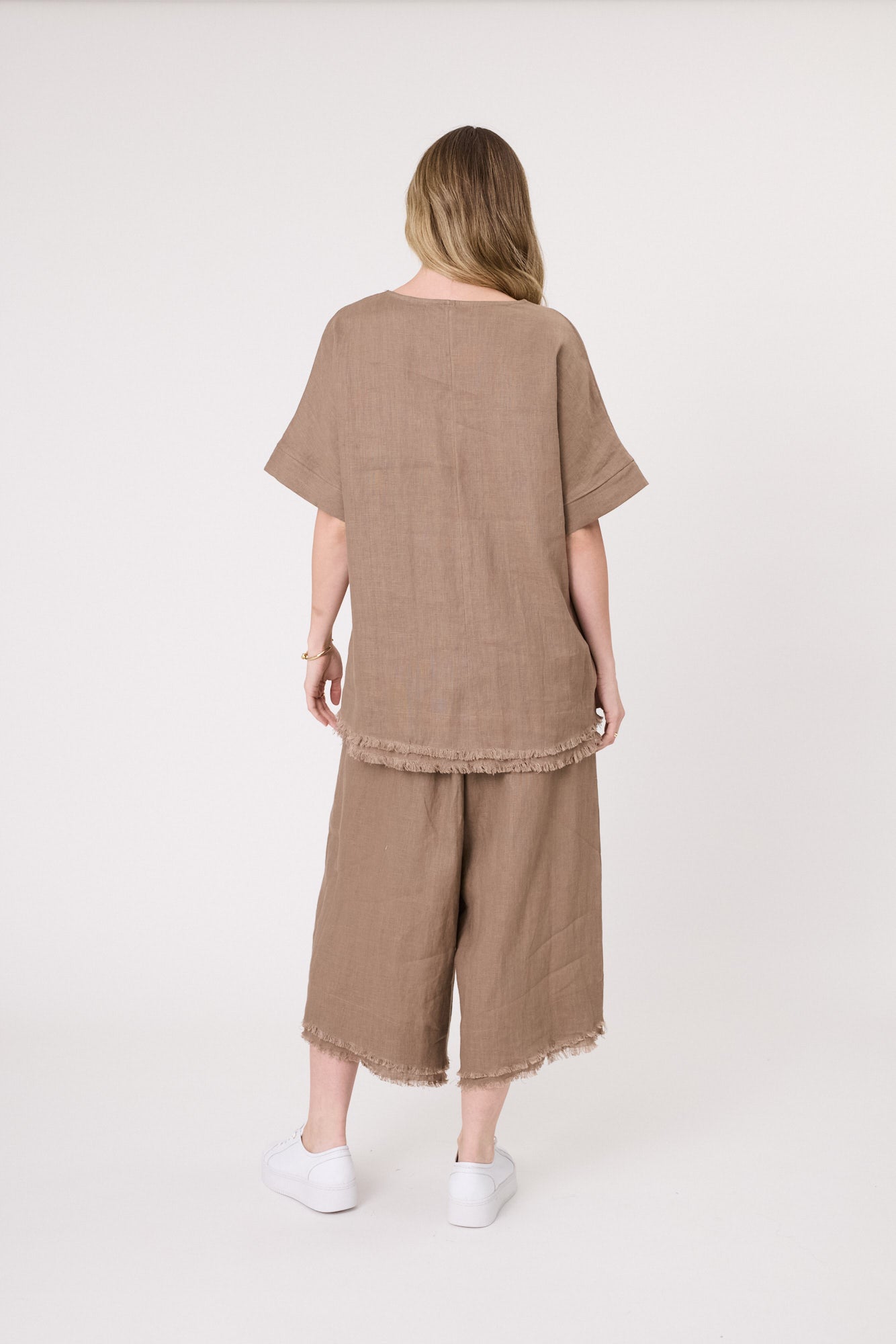 Elevate your warm-weather wardrobe with these relaxed linen pants, designed for effortless comfort and easy everyday style. Crafted in breathable linen with a loose silhouette, they offer relaxed movement and a laid-back look, finished with functional side pockets and a modern frayed hem. Style them with the Carola Top for a perfectly coordinated outfit.