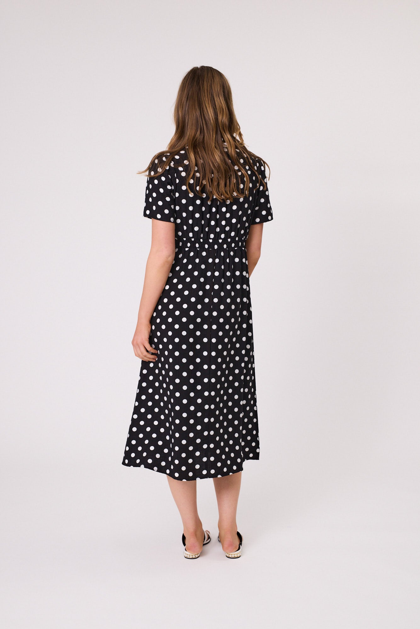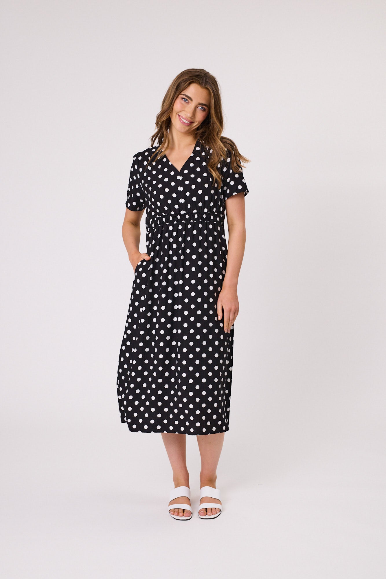 The Sadie Shirred Waist Dress combines comfort and effortless style. Crafted from soft viscose, it features a flattering V-neck and short sleeves for a classic, feminine look. The shirred waist creates a comfortable, defined shape, while the calf-length design adds an elegant touch. Perfect for casual days or dressed-up occasions, this dress is a versatile wardrobe favourite.
