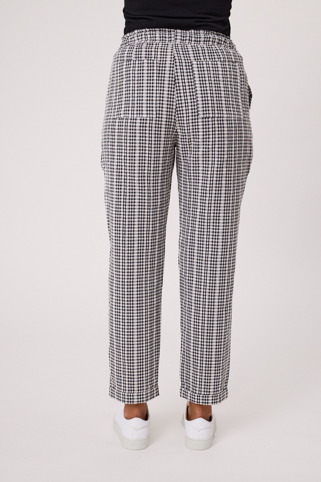 A versatile women’s pant in a classic black and white check print — the perfect mix of comfort and style. Designed with an elastic waistband and drawstring tie for the ideal fit, plus angled front pockets for an easy, relaxed feel. Pair with your favourite black or white top for an effortlessly chic look that takes you from coffee catch-ups to evening wine dates in style.