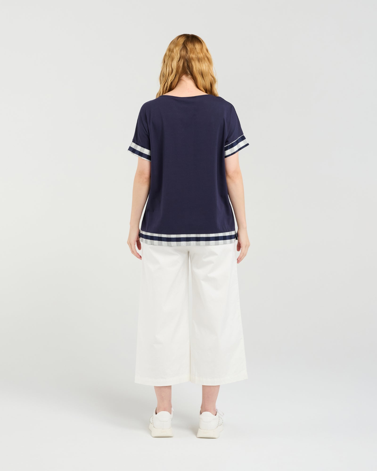 The Luna Top in Ink Check puts a fresh spin on a classic T-shirt. Featuring contrast check fabric detailing around the sleeves and waist, it adds subtle style and interest to your everyday look. Crafted from a soft cotton-spandex blend for comfort and stretch, this versatile piece is perfect for effortless, casual dressing.