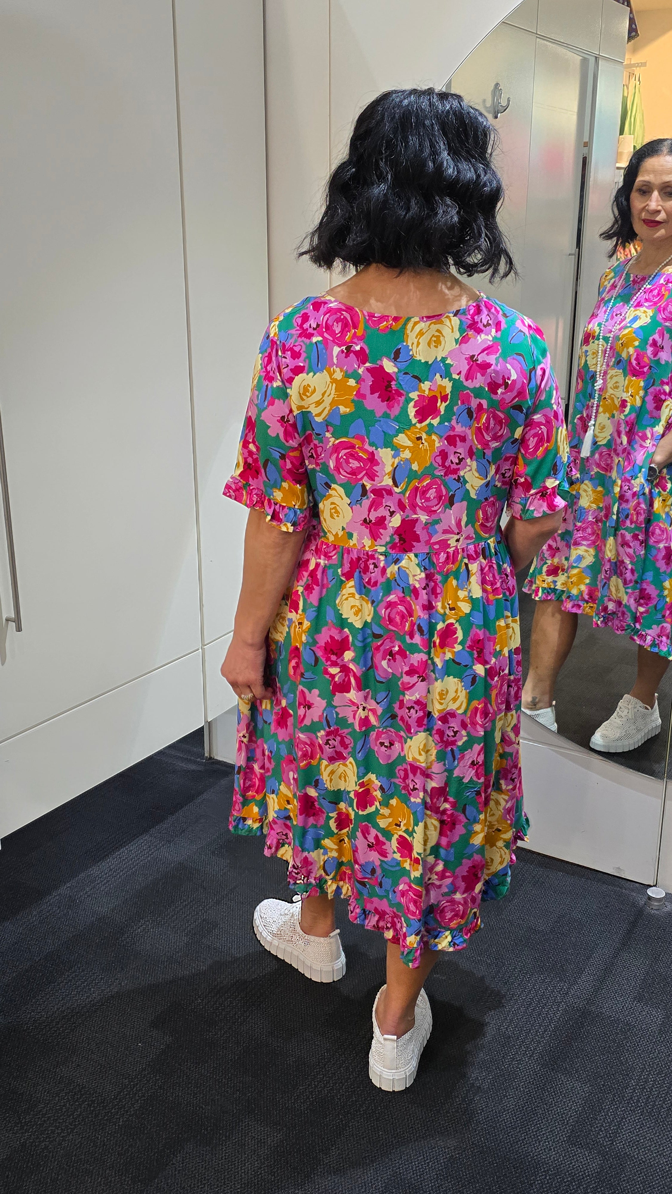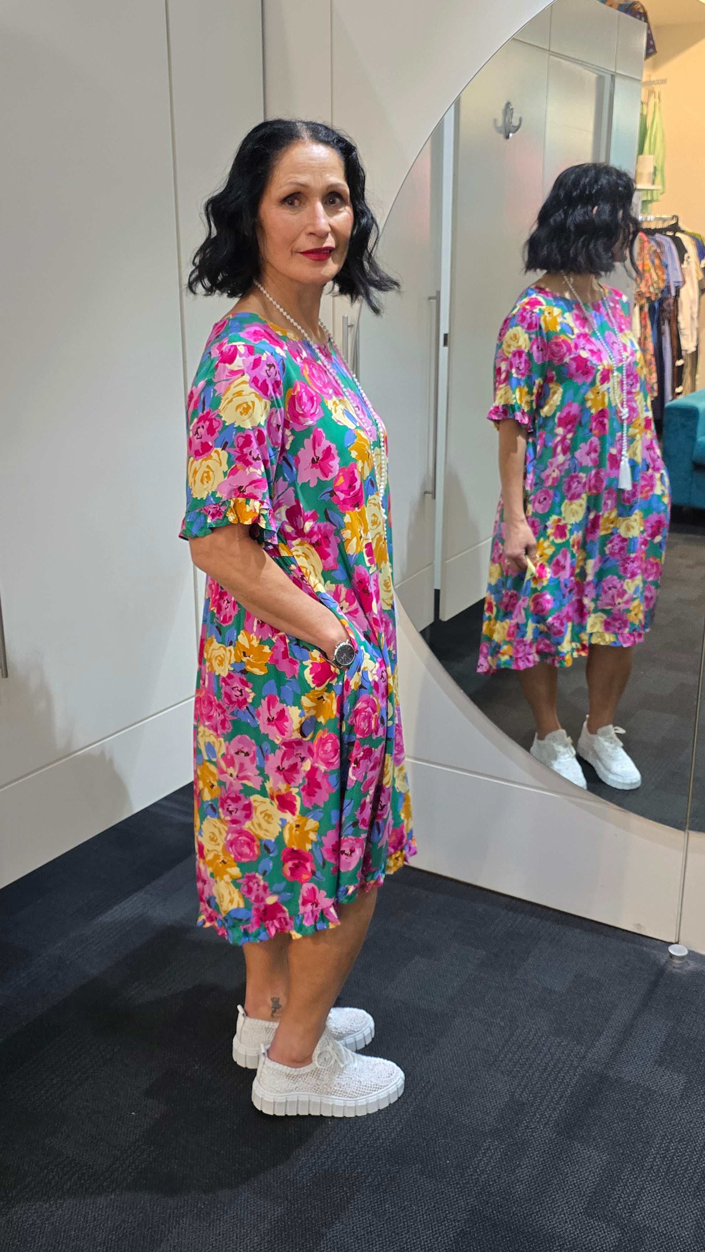 Stay cool and stylish with this A-line floral dress, perfect for hot summer days. Featuring a hi-low front and back, frill sleeves, and a frilled hemline, it adds a playful, feminine touch. The round neckline and side pockets combine practicality with effortless style, making it ideal for casual outings or summer events.