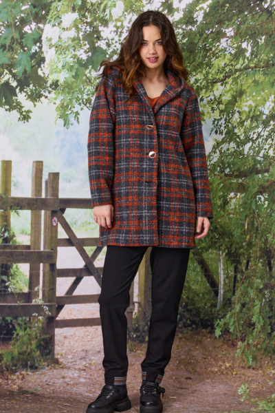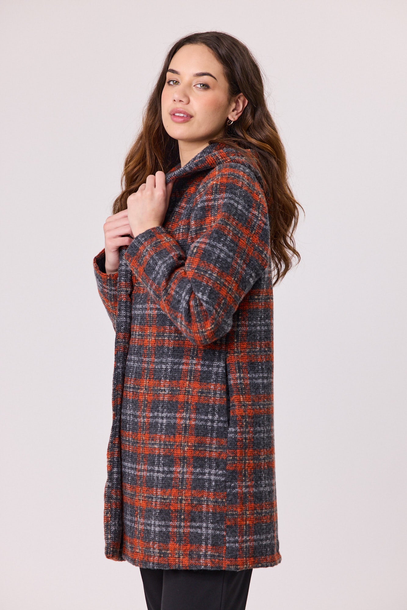 Stay warm and stylish this winter with this standout check jacket. Designed with a cosy lined interior and practical hood, it offers warmth without compromising on style. The front features three statement button details that add a unique twist, while the classic check pattern in dark grey, silver, and tan creates a timeless, sophisticated look.