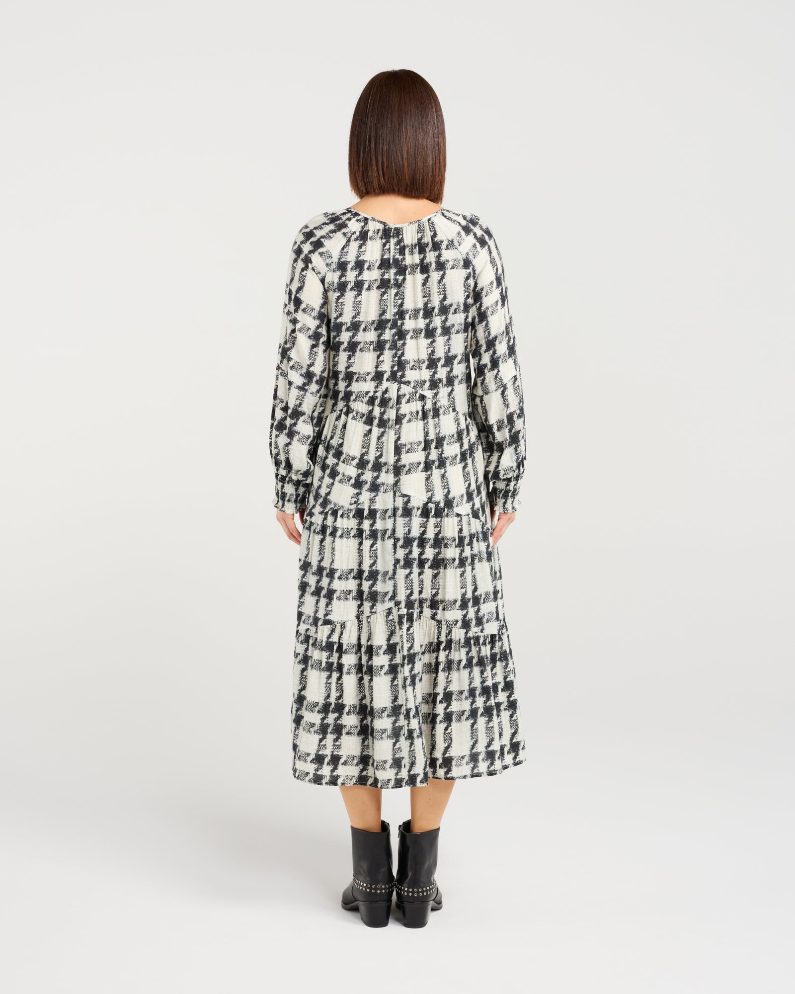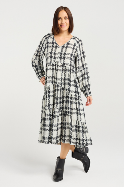 Effortlessly elegant, this long-sleeve dress features a relaxed fit with a softly tiered skirt that creates beautiful movement. The flattering V-neckline and flowing silhouette offer a refined yet comfortable look, perfect for everyday wear or elevated winter styling. Designed to fall below the knee, it’s a timeless wardrobe staple with understated charm.